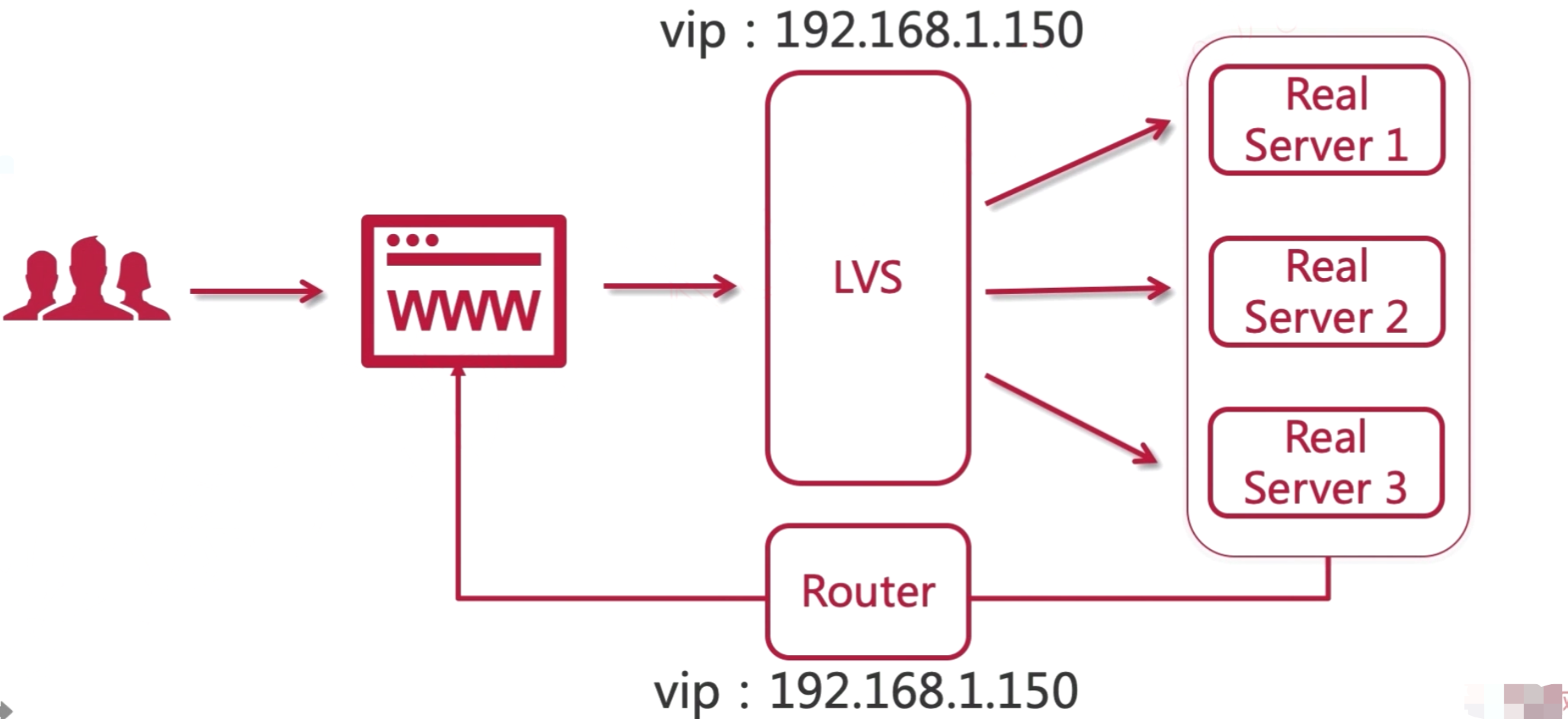 DR模型和TUN模型相似,LVS只处理请求,响应由每个服务器节点返回,但是不同的是,服务器节点返回响应统一由路由返回,这样上游的服务器节点就不会暴漏在公网上面,大大提高的安全性。 用户通过虚拟IP访问,响应时,在路由出也构建一个虚拟IP来统一返回响应。对于用户来说,通过虚拟IP,将服务器给隐藏了起来